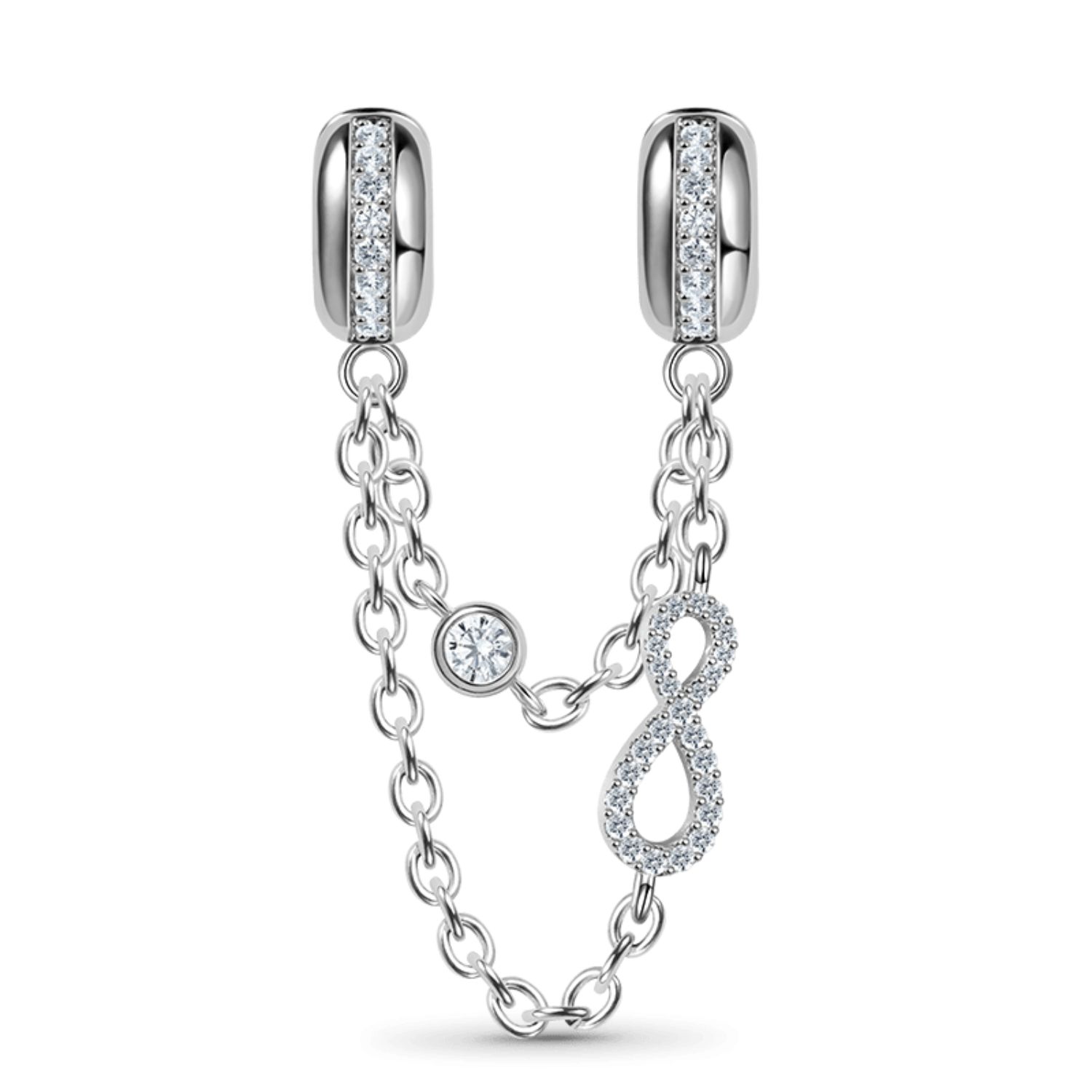 Dies ist eine Sicherheitskette, die mit jedem Armband getragen werden kann. Es besteht aus zwei Perlen, die durch eine Kette verbunden sind. Ein Unendlichkeitssymbol Anhänger und ein großer runder Kristallstein hängen unter den Perlen, es ist einfach und elegant.