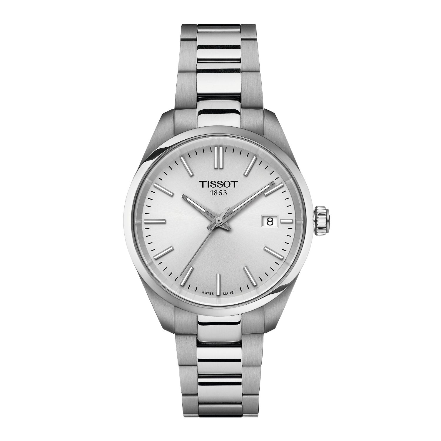 Dieses Tissot PR 100 Modell verfügt über ein 34 Millimeter messendes 316L-Edelstahlgehäuse und ein präzises Swiss Made Quarzwerk mit Endanzeige der Batterielebensdauer. Sein silberfarbenes Zifferblatt mit Stabindizes und Datumsanzeige liegt gut geschützt unter kratzfestem Saphirglas. Das 316L-Edelstahlarmband mit Schnellwechselsystem erlaubt einen einfachen, werkzeuglosen Austausch