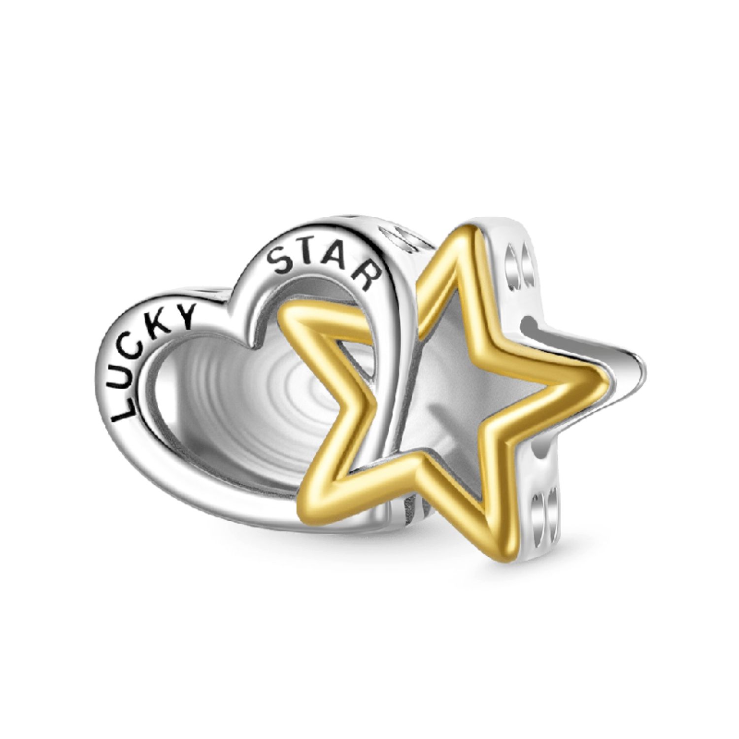 Feiern Sie die magischen Verbindungen des Lebens mit diesem doppelseitigen Charm, der 925er Sterling Silber und 18K vergoldete Akzente vereint. Auf der Vorderseite steht „LUCKY STAR“, während die Rückseite eine glatte herzförmige Fläche für persönliche Gravuren bietet - ideal für Initialen, Daten oder Geheimcodes.