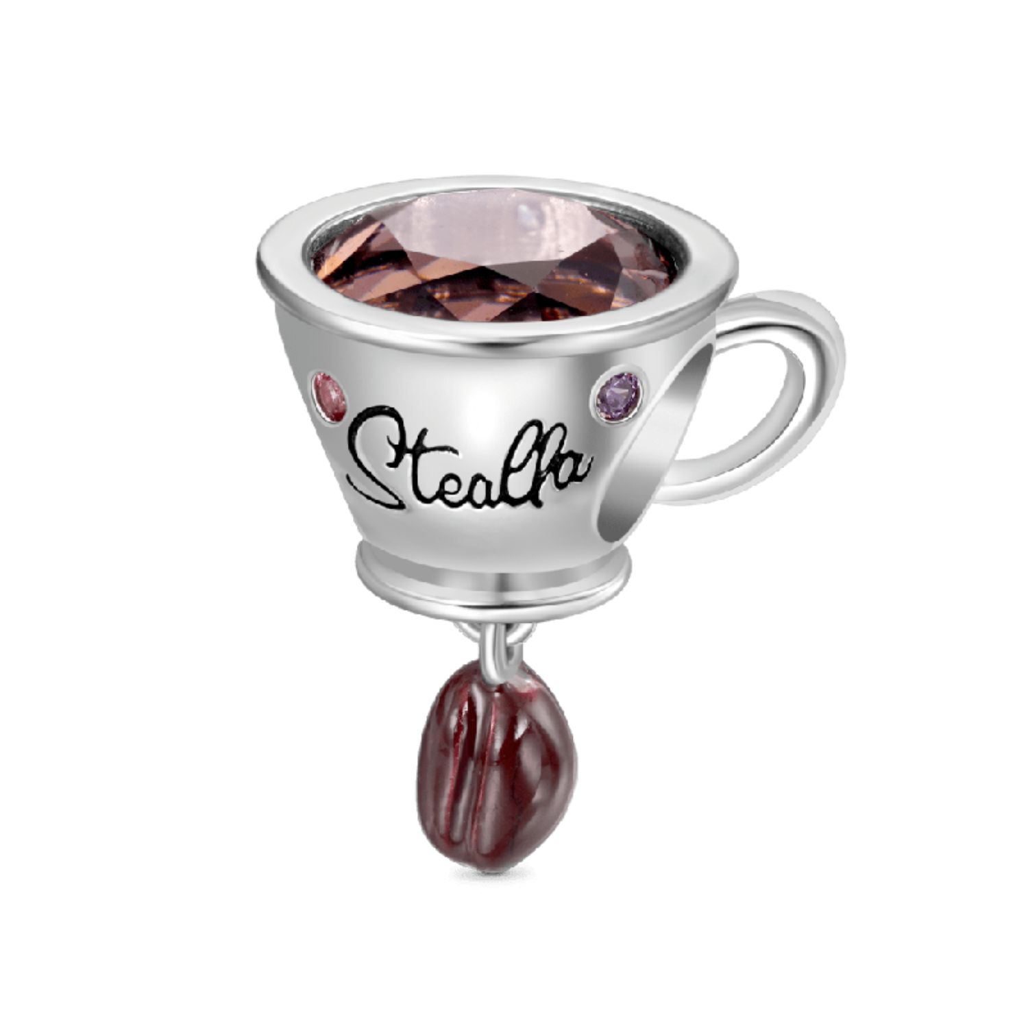 Der aus 925er Sterlingsilber gefertigte Anhänger zeigt ein zartes Kaffeetasse-Design, das mit attraktiven mehrfarbigen Edelsteinen akzentuiert ist, und eine Kaffeebohne, die unter der Tasse baumelt. Die Tasse kann mit Namen, Initialen oder einer besonderen Botschaft graviert werden, was sie zu einem einzigartigen und personalisierten Accessoire macht.