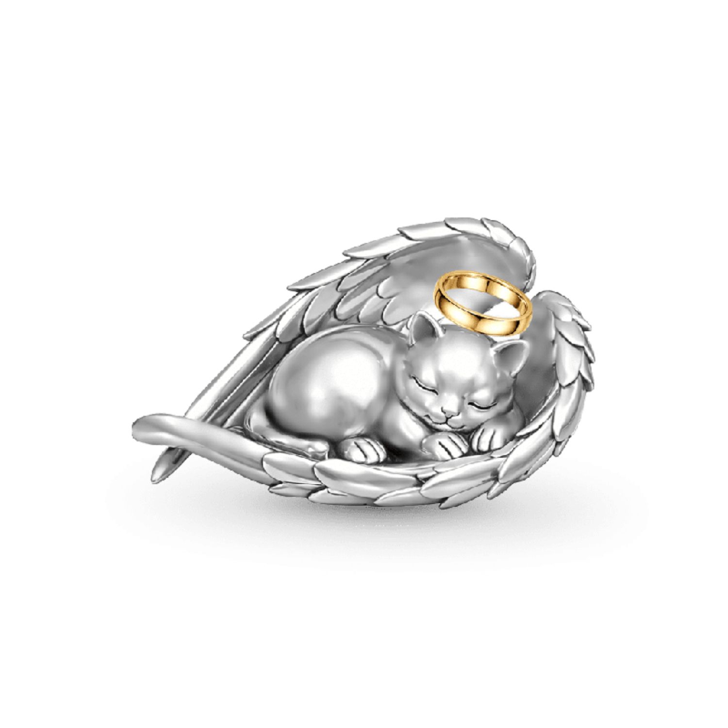 Die 925 Sterlingsilber Haustier Gedenken Katze Gravierbar Charm Perle ist eine zarte Hommage an Ihren geliebten Stubentiger. Dieser Charm zeigt eine schlafende Katze, eingebettet in Engelsflügel, gekrönt von einem 18 Karat goldplattierten Heiligenschein. Der Flügel lässt sich mit dem Namen Ihrer Katze gravieren und schafft ein personalisiertes Andenken, um Ihren treuen Begleiter zu ehren. Es lässt Sie die warme Erinnerung an Ihr Haustier nah am Herzen tragen.