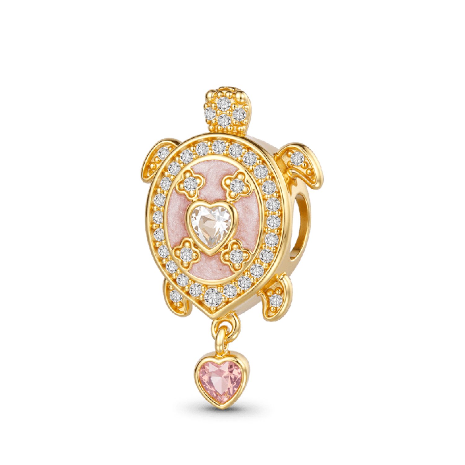 Umfassen Sie die sanfte Weisheit des Ozeans mit diesem exquisiten Meeresschildkröten Charm. Sorgfältig aus 925 Sterlingsilber handgefertigt und mit strahlendem 18-karätigem Gold überzogen, fängt dieses Bead die anmutigen Flossen und die detaillierte Schale der Schildkröte ein, die mit rosa Emaille akzentuiert ist. Verziert mit funkelnden Zirkonia-Steinen, die glitzernde Wassertropfen imitieren, symbolisiert dieses Schmuckstück Langlebigkeit, Schutz und friedliche Reisen. Perfekt für Meeresliebhaber und alle, die nach bedeutungsvollem Schmuck suchen, vermittelt er die ruhige Stimmung des Meeres. Ein zeitloses Accessoire, das die Schönheit der Natur zelebriert und jeder Kollektion einen Hauch von magischem Glanz verleiht.