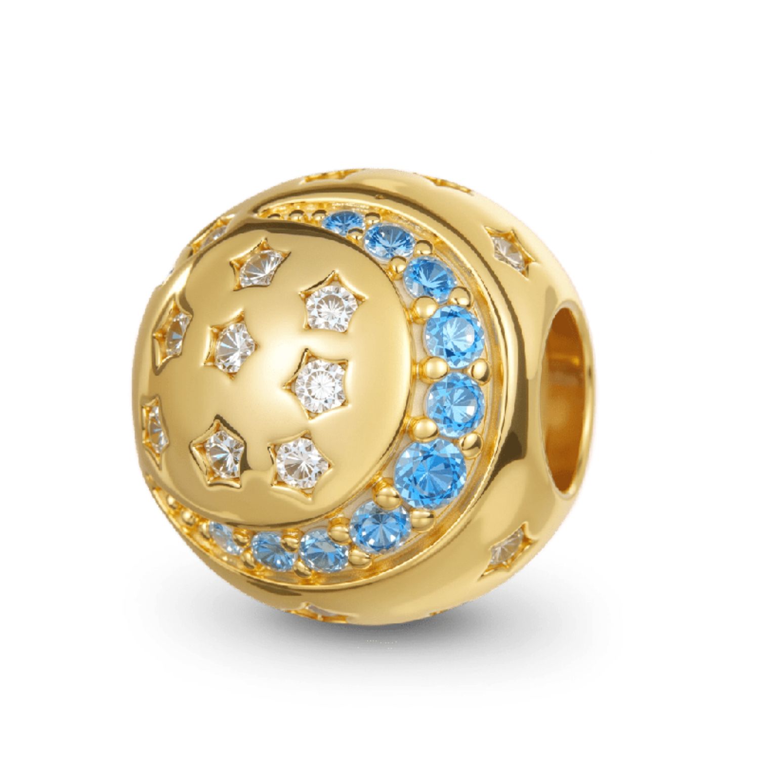 Schmücken Sie sich mit der Magie einer himmlischen Romanze. Dieser exquisite Charm aus 925 Sterlingsilber mit 18 Karat Goldbeschichtung zeigt einen Mond, der mit einem blauen Zirkoniastein verziert ist, und Sterne, die mit weißen Zirkoniasteinen funkeln. Er fängt die bezaubernde Schönheit einer sternenhellen Nacht ein und ist damit ein traumhaftes und vielseitiges Schmuckstück, das jedem Stil einen Hauch von ewiger Romantik verleiht.