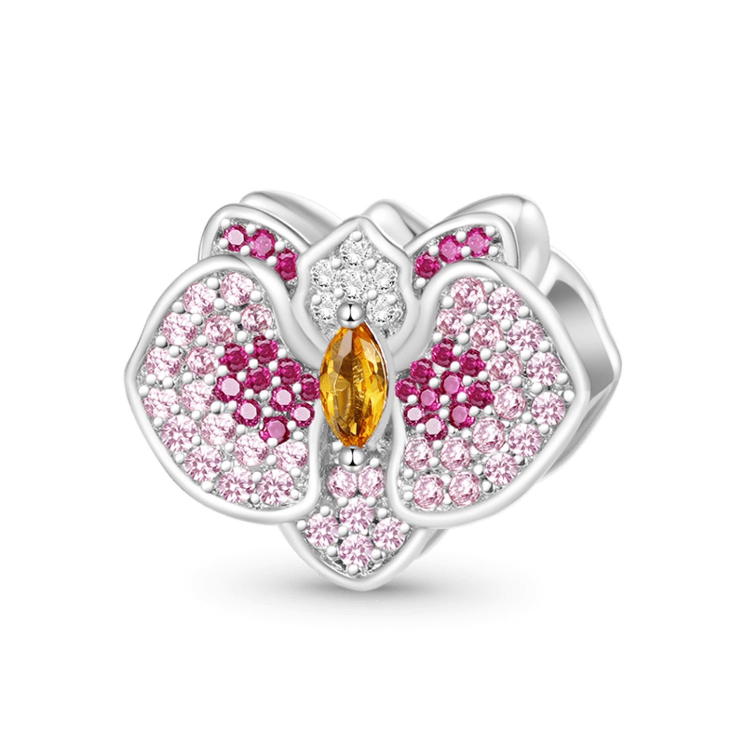 Dieser exquisite Charm ist handgefertigt aus 925 Sterlingsilber. Der Charm ist mit einem komplizierten Orchideenblütenmotiv verziert. Die rosaroten Staubgefäße verleihen dem ganzen Charm Anmut und Eleganz, ohne seine Beweglichkeit zu verlieren. Er ist ein wunderbares Geschenk für Verwandte und Freunde und steht für gute Wünsche.