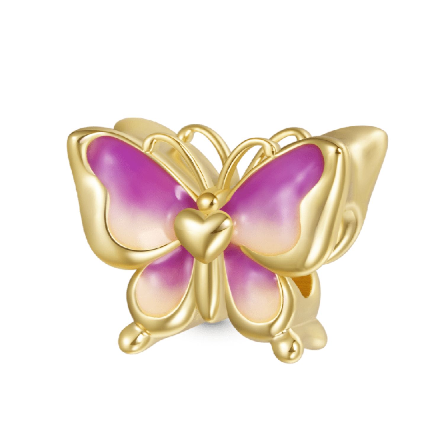 Dieser bezaubernde Charm fängt die ätherische Schönheit eines Schmetterlings im Flug ein. Der Anhänger ist aus 18 Karat vergoldet und hat einen faszinierenden violetten Farbverlauf. Der Schmetterling tanzt anmutig, wenn das Licht die filigranen Details einfängt. Dieses bezaubernde Accessoire zelebriert die natürliche Eleganz dieser zarten Geschöpfe und erweckt ein Gefühl von Laune und Staunen.