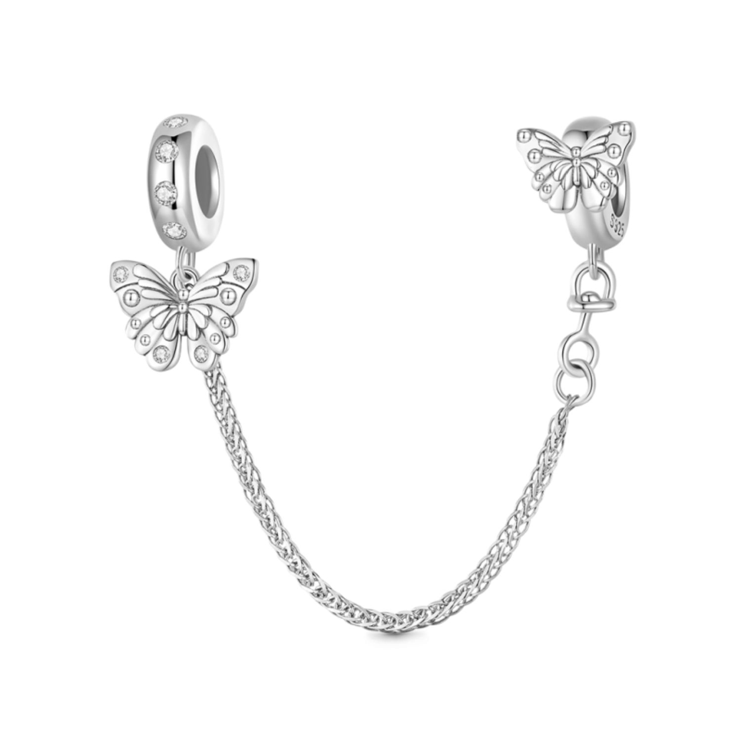 Der Schmetterling mit Sicherheitskette Charm ist aus 925er Sterlingsilber gefertigt. Geschmückt mit schimmernden Zirkonia auf den zarten Schmetterlingsflügeln, verkörpert dieser Charm Eleganz und Schönheit. Er dient als perfekter Begleiter durch den Lärm des Lebens und Momente der Einsamkeit und symbolisiert Transformation und Widerstandsfähigkeit.