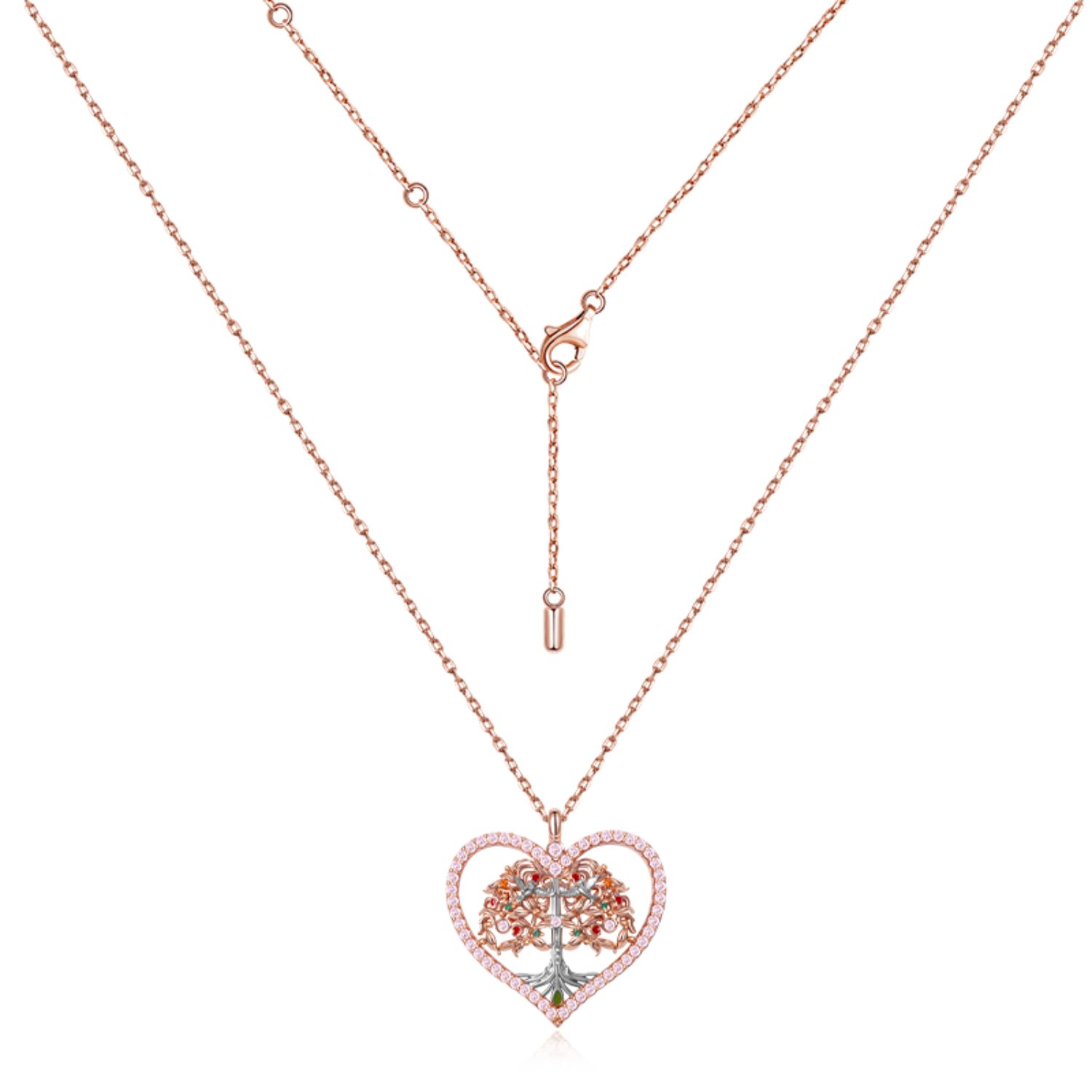 Diese funkelnde Lebensbaumkette aus Roségold symbolisiert die Liebe und den Wohlstand der Familie. Mit bunten Steinen am Baum des Lebens, einem Schwalbenpaar, das zum Baum fliegt, und einem großen Kristallherz, das den ganzen Baum umgibt.