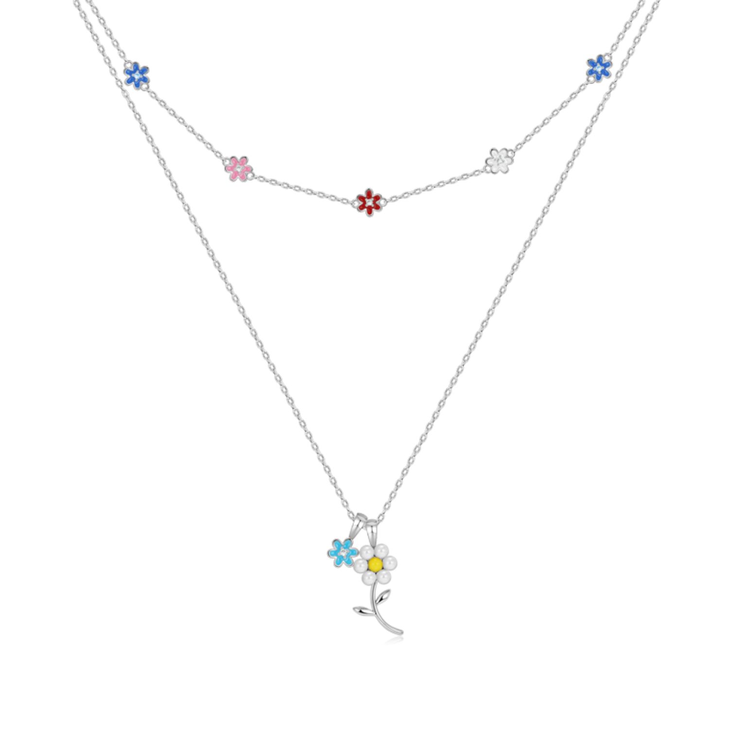 Tragen Sie eine zarte und schöne Gänseblümchen Perlen Stapel Halskette mit dem funkelnden Gänseblümchen Blume Charm. Mit Gänseblümchen Perlen das Design-Element, das durch die Stärke der Blume, die in der Not blüht und symbolisiert die Freiheit inspiriert. Das 925 Sterling Silber mit bunten Gänseblümchen auf der Halskette sieht bezaubernd aus.