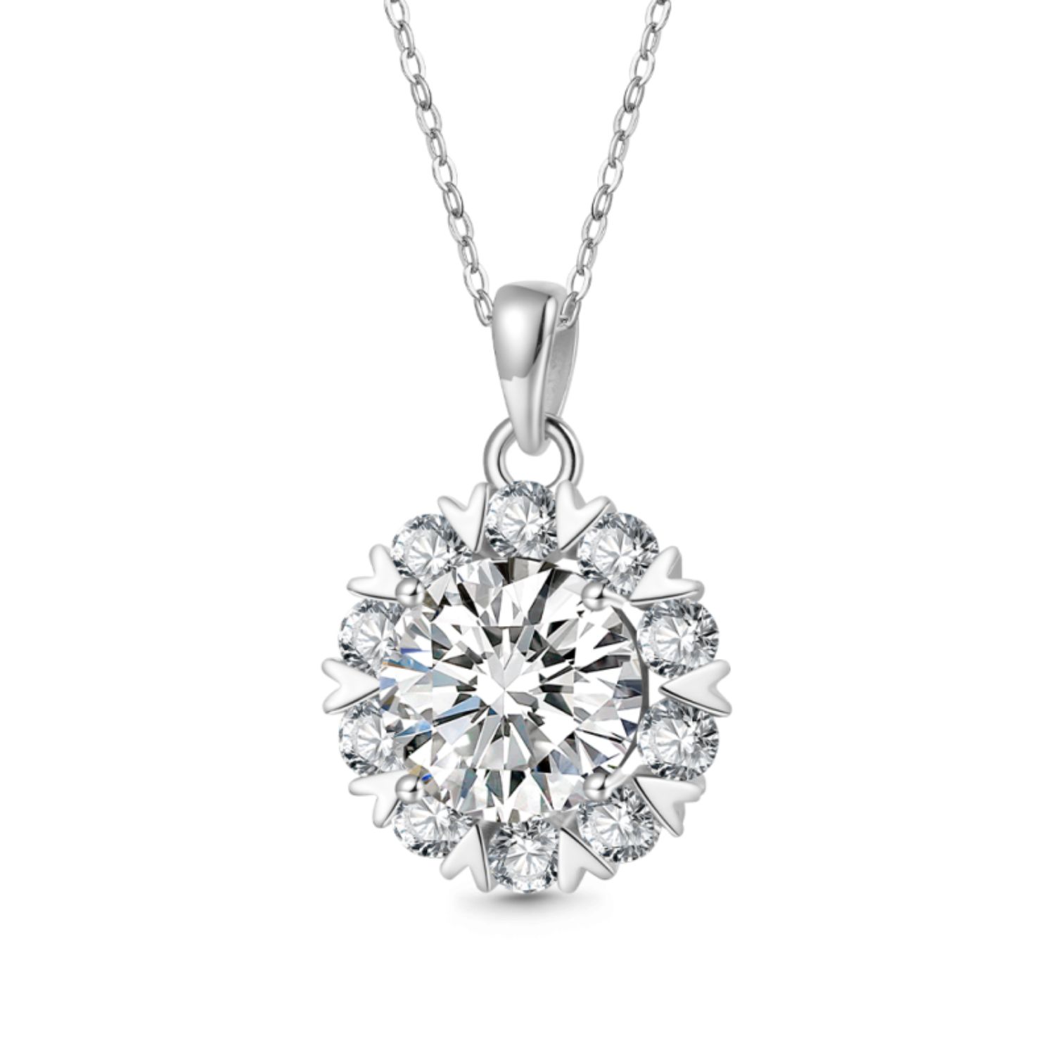 Sehen Sie verschwenderisch aus mit dieser Sterlingsilber-Halskette mit 5ct Moissanite Steinen, die in einer Nadelradblume platziert sind und VVS1 Klarheit und D Farbe haben. Glänzende Details auf der Oberseite unterstreichen das einzigartige Design dieses klassischen Anhängers, der wunderschön an einer sich verjüngenden Öse hängt. Der sorgfältig geschliffene Moissanit besitzt eine Brillanz, die mit der eines Diamanten vergleichbar ist. Er leuchtet hell in der Sonne und unterstreicht die Eleganz, das sanfte Temperament und die göttliche Aura der Frau.
