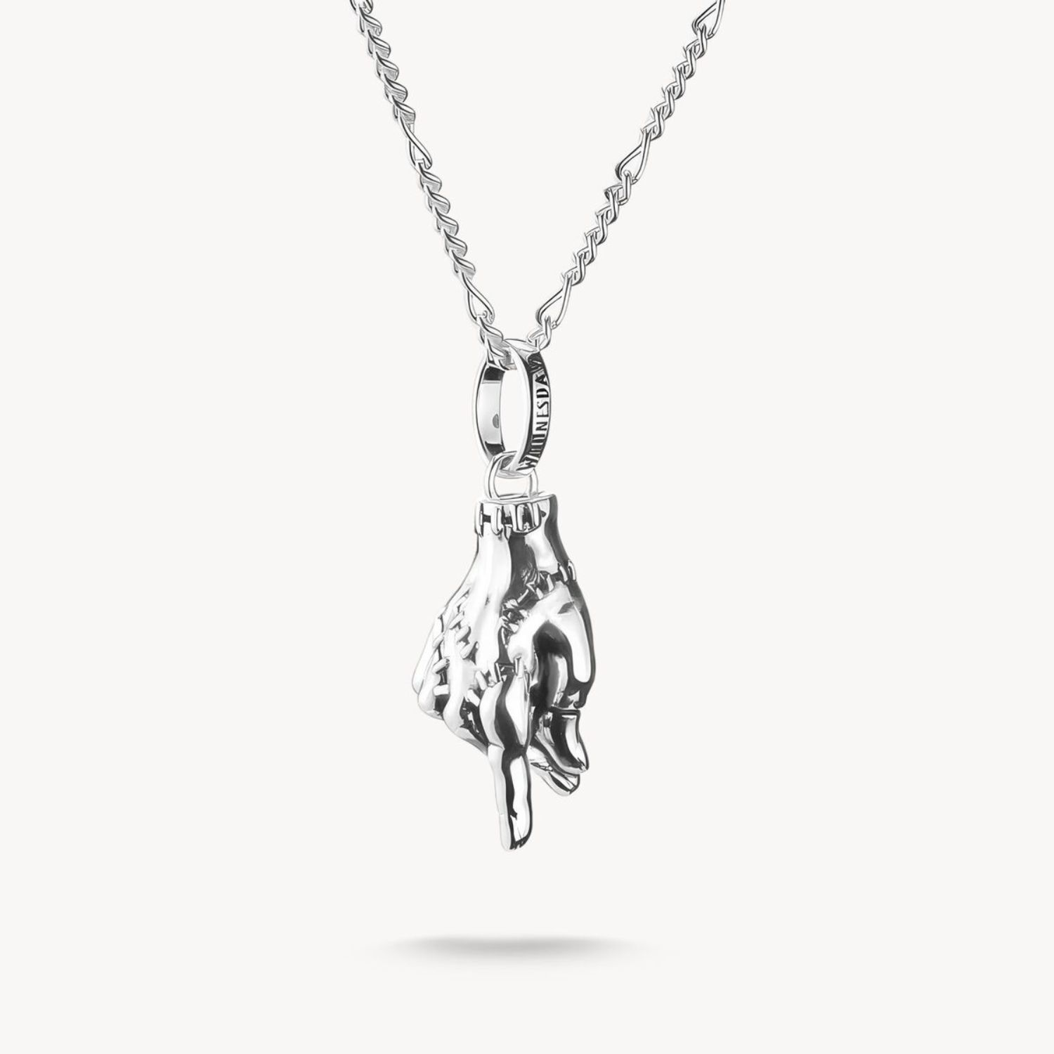 Das berühmte „Eiskaltes Händchen“ erscheint bei dieser Kette als Anhänger. Aus oxidiertem recyceltem 925 Sterling Silber gefertigt, sind alle Details der Hand sorgfältig ausgearbeitet und fangen die ikonische Präsenz der Serie ein. Ergänzt durch eine feine Silberkette entsteht ein Schmuckstück, das subtil und gleichzeitig kraftvoll wirkt – ein Symbol für Geheimnisse, Loyalität und die Welt von Wednesday.