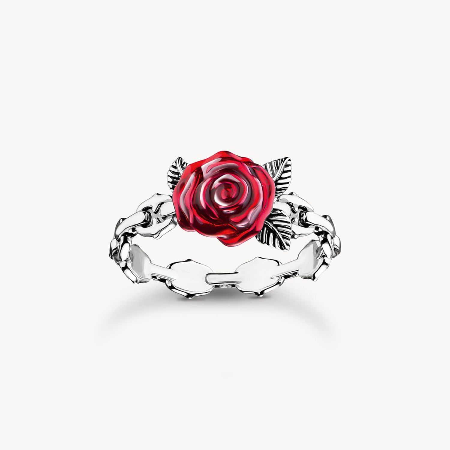 Zeige mit diesem Rosen-Ring deine Leidenschaft für tiefe Gefühle. Das viktorianisch inspirierte Design besteht aus recyceltem 925 Sterling Silber. Von Hand aufgetragene Emaille in Rot zieht die Blicke auf die dramatisch gestaltete Blüte, die von fein gravierten Blättern begleitet ist. Stilisierte Dornen reihen sich als Ringschaft aneinander und unterstreichen die Ausstrahlung dieses außergewöhnlichen Rings.