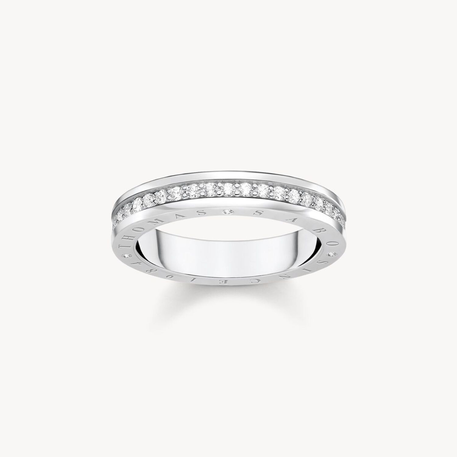 Ein eleganter, rundum mit Zirkonia-Steinen besetzter Bandring. Die seitliche Gravur verweist auf den unverkennbaren Stil von THOMAS SABO: seit dem Jahr 1984 Synonym für hochwertigen Schmuck aus recyceltem 925 Sterling Silber und Zirkonia.